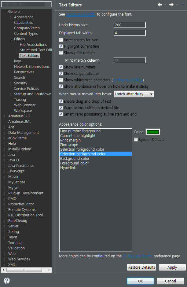 상단바 Window -> Preferences -> General -> Editors -> Text Editors