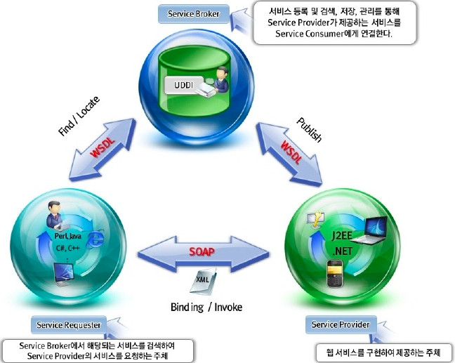 WSDL: 웹 서비스명, 제공 위치, 메시지 포맷, 프로토콜 정보 등 웹 서비스에 대한 상세 정보를 기술한 파일