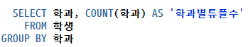 | 16 | SQL 작성 -결과- 학과 학과별 튜플수 전기 1 컴퓨터 2 전자 2 [참고사항] where 사용금지, group by 사용, 집계함수 사용 alias사용, 세미콜론 생략가능, 인용 필요시 ' 사용 |